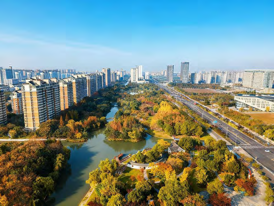 “天蓝、地绿、水清”的生态通州越来越迷人。随着天气变冷,城区迎来一年中色彩最绚烂的时节,树叶呈现出绿、黄、红等多种颜色,五彩斑斓,令人陶醉。图为无人机拍摄的南通高新区横河景观带。 卑多敏 摄
